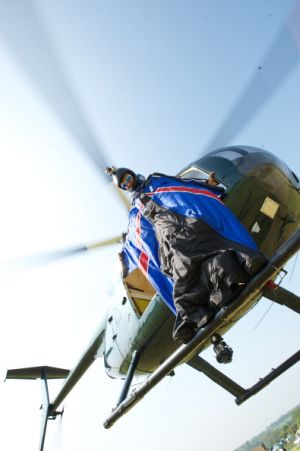 パラシュートではなく、この日のために作った特別な用具を着用。英国南部で、約730メートルの上空からヘリで、着地点に敷き詰めたダンボール箱めがけて飛び降りた。
